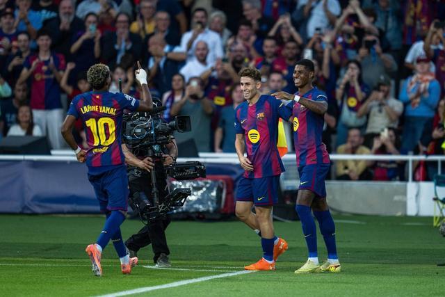 10月21日,巴塞罗那队球员佩德里(左二)在比赛中进攻。当日,在2025-2026赛季欧冠联赛阶段第三轮比赛中,西甲巴塞罗那队主场6比1战胜希腊奥林匹亚科斯队。新华社发(胡安·戈萨摄)